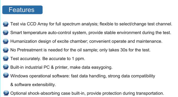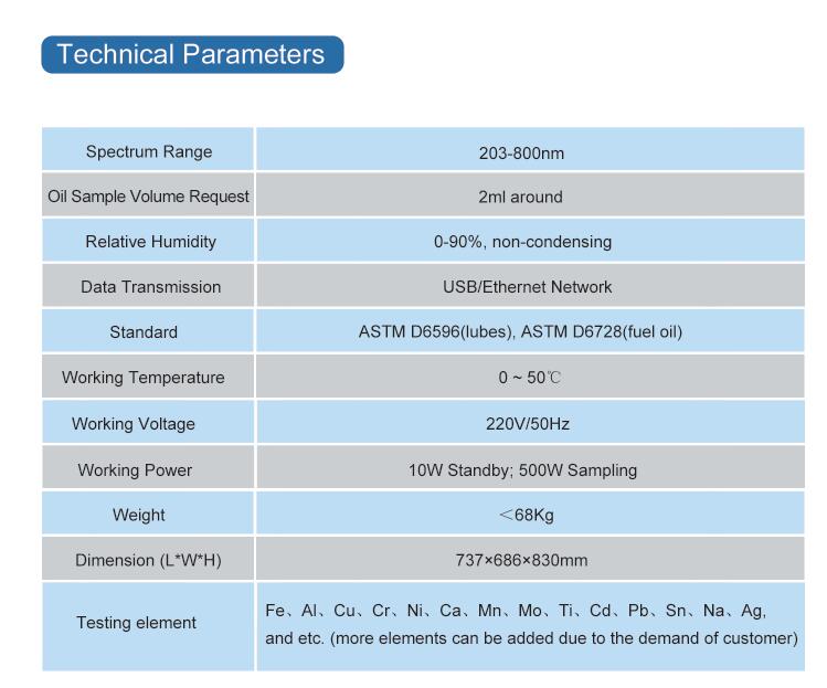 OCI-1 Type Oil Spectrum Analyzer tests lubricants, hydraulics, fuel oil, anti-freeze fluid, etc. It is widely used in the fields of aviation, petrochemical, mining, shipping, electric power and so on. It tests more than 30 types of element inside the oil, monitors mechanical wear, and helps to control oil quality.